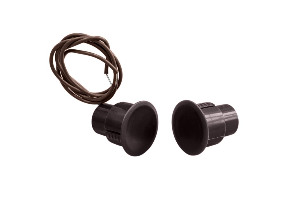 Hnedé dverné čidlo určené na zapustenie do dverí. Magnetický spínač slúži ako kontakt pre dverný alarm, indikácia pre automatické zatváranie alebo ako rozpínacie čidlo automatizačných prvkov.